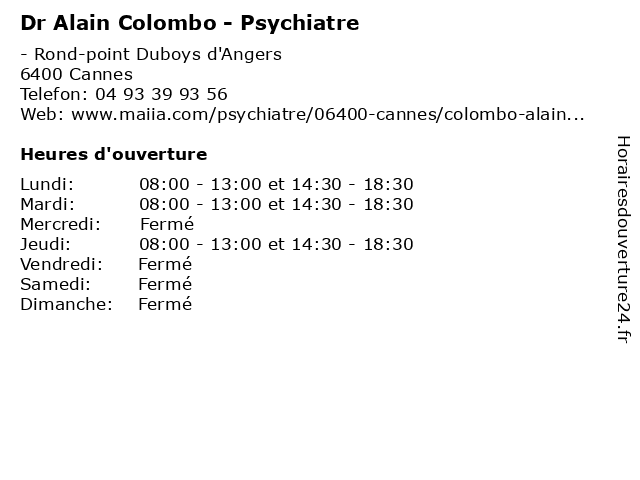 1 Dr Marie-France Anfossi-Colombo - Psychiatre (Distance: 0,00 km) - Rond-point Duboys d'Angers, 06400 Cannes anfossi, colombo, dr, france, marie, psy, psychiatre, sante, soins 2 MICHAT ALAIN (Distance: 0,05 km) 9 Rond-Point Duboys d'Angers, 06400 Cannes alain, boutique, couture, fourrure, michat, prêt-à-porter, robes 3 Green Acres (Crespi Alain) (Distance: 0,23 km) 84 Rue D'antibes, 06400 Cannes acres, alain, apartment rentals, crespi, green, home sales, real estate 4 Maître Alain Lerda - Avocat (Distance: 0,45 km) 17 rue Saint Honoré, 06400 Cannes alain, avocat, avocate, avocats, civils, droits, juridiques, lerda, maître 5 Medecin Alain Azencott (Chirurgien vasculaire) (Distance: 0,46 km) 23 Hoche, 06400 Cannes alain, azencott, chirurgien, docteur, medecin, sante, services, vasculaire 6 Dr Eric Vaast - Psychiatre (Distance: 0,48 km) 46 Rue des Serbes, 06400 Cannes dr, eric, médecins, médicaments, psychiatre, santé, secrétariat, spécialiste, vaast  |