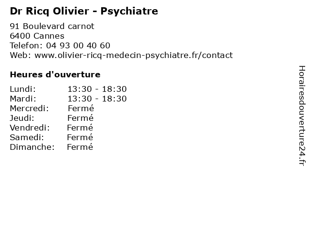 Termes de recherche pour Dr Ricq Olivier - Psychiatre:cannes, olivier, docteur, dr, psychiatre, ricq  |