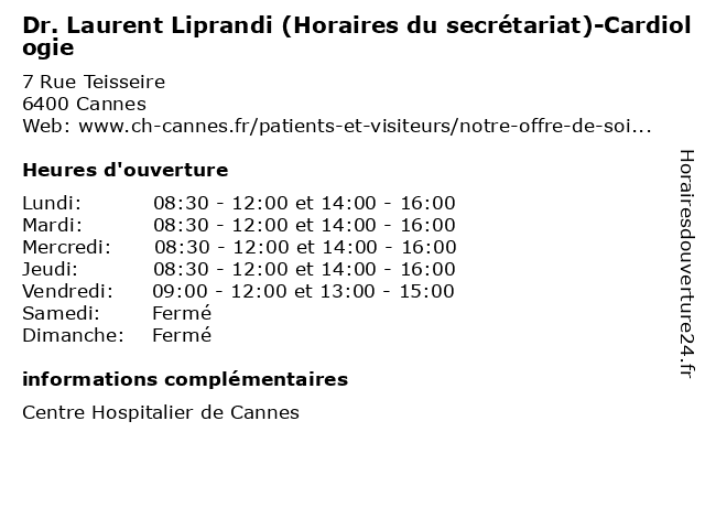 1 Dr. Thierry Tibi (Horaires du secrétariat)-Cardiologie (Distance: 0,00 km) 7 Rue Teisseire, 06400 Cannes cardiologie, docteur, dr., du, horaires, medecins, sante, secrétariat, thierry, tibi 2 Dr. Frederique Demerges (Horaires du secrétariat)-Cardiologie (Distance: 0,00 km) 7 Rue Teisseire, 06400 Cannes cardiologie, demerges, docteur, dr., du, frederique, horaires, medecins, sante, secrétariat 3 Dr. Valerie Marro (Horaires du secrétariat)-Cardiologie (Distance: 0,00 km) 7 Rue Teisseire, 06400 Cannes cardiologie, docteur, dr., du, horaires, marro, medecins, sante, secrétariat, valerie 4 Dr. Anne Talbodec (Horaires du secrétariat)-Cardiologie (Distance: 0,00 km) 7 Rue Teisseire, 06400 Cannes anne, cardiologie, docteur, dr., du, horaires, medecins, sante, secrétariat, talbodec 5 Dr. Giles Zemour (Horaires du secrétariat)-Cardiologie (Distance: 0,00 km) 7 Rue Teisseire, 06400 Cannes cardiologie, docteur, dr., du, giles, horaires, medecins, sante, secrétariat, zemour 6 Dr. Nathalie Berkane (Horaires du secrétariat)-Cardiologie (Distance: 0,00 km) 7 Rue Teisseire, 06400 Cannes berkane, cardiologie, docteur, dr., du, horaires, medecins, nathalie, sante, secrétariat |