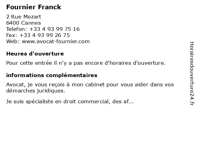 1 Maître Franck Ghigo - Avocat (Distance: 0,38 km) 1 rue de Suffren, 06400 Cannes avocat, avocats, civils, droits, franck, ghigo, juridiques, maître 2 Maître Franck Banere - Avocat (Distance: 0,54 km) 40 rue de Mimont, 06400 Cannes avocat, avocats, banere, civils, droits, franck, juridiques, maître 3 Dr. Franck Rague - Dentiste (Distance: 0,59 km) 13 Rue D'Antibes, 06400 Cannes dentiste, docteur, dr., franck, medecins, rague, sante 4 Dr. Franck Zakine (Horaires du secrétariat)-Dentiste (Distance: 0,73 km) 7 Rue Teisseire, 06400 Cannes dentiste, docteur, dr., du, franck, horaires, medecins, sante, secrétariat, zakine 5 Cabinet Vétérinaire Franck Lefay (Distance: 0,96 km) 45 Boulevard de la Croisette, 06400 Cannes cabinet, clinique, franck, lefay, service, veterinaire, vétérinaire 6 Dr. Franck Chiche - Dentiste (Distance: 3,79 km) 15 Boulevard Jacques Ugo, 06220 Vallauris chiche, dentiste, docteur, dr., dranck, franck, medecins, sante |