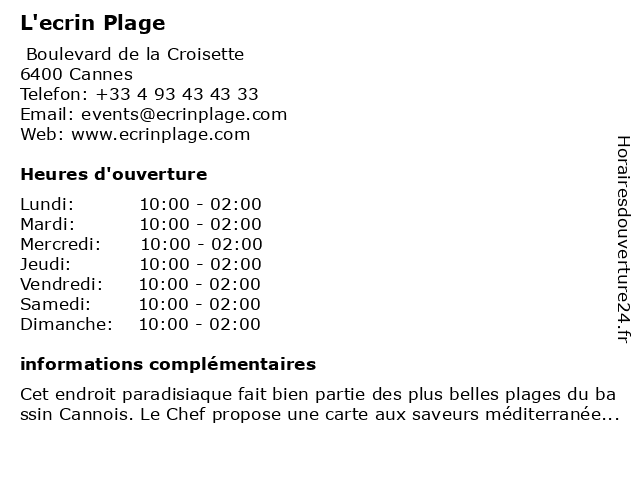 1 Bijou Plage Experimental (Distance: 0,17 km) Square Verdun Boulevard De La Croisette, 06400 Cannes bar, bijou, experimental, plage 2 Plage Des Dunes (Distance: 0,86 km) Boulevard De La Croisette, 06400 Cannes dunes, plage, restaurants 3 Vegaluna Plage - Juin à mi-octobre (Distance: 0,87 km) . Boulevard de la Croisette, 06400 Cannes activité, cocktails, juin, mi, octobre, plage, privé, restaurant, restauration, vegaluna 4 Miramar Plage (Distance: 1,02 km) 64 boulevard de la Croisette, 06400 Cannes activité, cocktails, miramar, plage, privé, restaurant, restauration 5 Hôtel Mercure Cannes Croisette Beach - Restaurant Plage (mars à octobre) (Distance: 1,30 km) 13 Rue du Canada, 06400 Cannes beach, cannes, croisette, de, hebergement, hotel, hôtel, mars, mercure, octobre, plage, restaurant, restauration, tourisme 6 Restaurant de la plage (Hôtel Gray d'Albion) (Distance: 1,64 km) 38 Rue des Serbes, 06400 Cannes cuisine, d'albion, de, gray, hôtel, la, plage, restaurant, restauration |