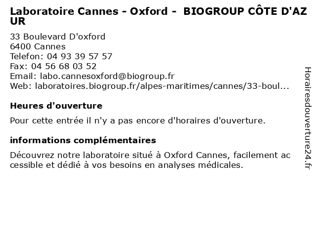 | Appeler Laboratoire Cannes - Oxford - BIOGROUP CÔTE D'AZUR | |
