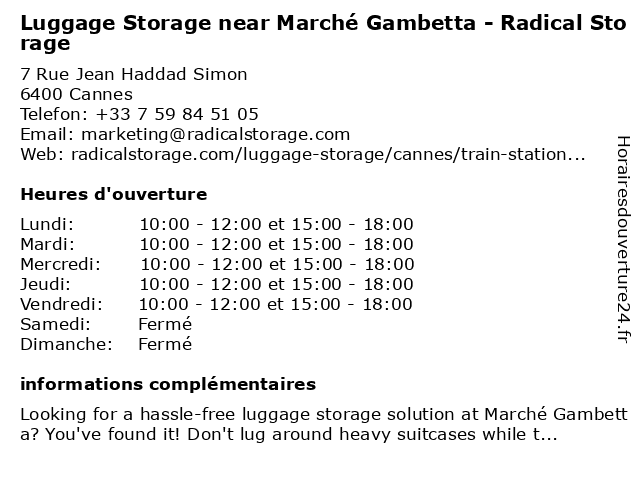 1 Radical Storage - Luggage Storage Rue Haddad Simon Cannes Station (Distance: 0,03 km) 14 Rue Jean Haddad Simon, 06400 Cannes cannes, haddad, luggage, luggage storage, luggage storage near me, radical, rue, simon, station, storage 2 Radical Storage - Luggage Storage Near Cannes Train Station (Distance: 0,05 km) 2 Rue Louis Braille, 06400 Cannes cannes, luggage, luggage storage, luggage storage near me, near, radical, station, storage, train 3 Droguerie Gambetta - Espace culinaire (Distance: 0,12 km) 10 Place Gambetta, 06400 Cannes culinaire, droguerie, espace, gambetta, magasins 4 Eurofins - Laboratoire d'analyses médicales Cannes Gambetta (Distance: 0,15 km) 2 Place Gambetta, 06400 Cannes cannes, d'analyses, eurofins, gambetta, laboratoire, médicales 5 Marché provençal Gambetta à Cannes (Distance: 0,17 km) . Place Gambetta, 06400 Cannes cannes, frutas, gambetta, hortalizas, marché, mercado, provençal, verduras 6 Serrurerie Cordonnerie Gambetta (Distance: 0,18 km) 8 Rue Allieis, 06400 Cannes cordonnerie, gambetta, serrurerie |