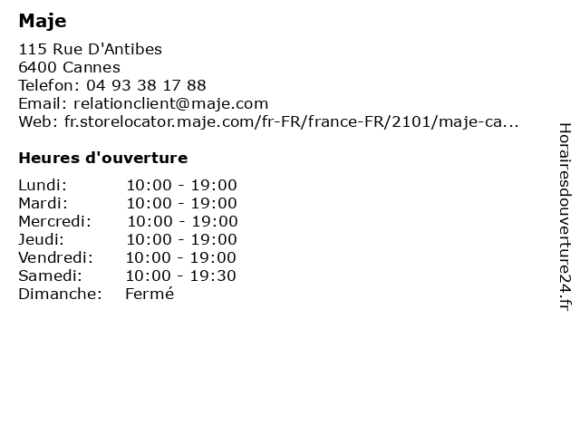 1 Maje (Distance: 18,12 km) - Avenue Eugène Donadeï, 06700 Saint-Laurent-du-Var accessoires, chaussures, habillement, maje, mode, vetement 3 Father & Sons (Distance: 0,11 km) 108 Rue d'Antibes, 06400 Cannes accessories, costume, father, mode, pantalons, pulls, sons 4 Ekyog (Distance: 0,79 km) 10 Rue d'Antibes, 06400 Cannes accessories, dresses, ekyog, gift cards, jackets, pulls, skirts, varnish 5 Maje (Distance: 25,23 km) 1 Rue François Premier, 06000 Nice accessoires, chaussures, femme, maje, mode, pulls, sacs, vetements 6 Maje (Distance: 25,46 km) 6 Avenue Jean Medecin, 06000 Nice accessoires, chaussures, femme, maje, mode, pulls, sacs, vetements |