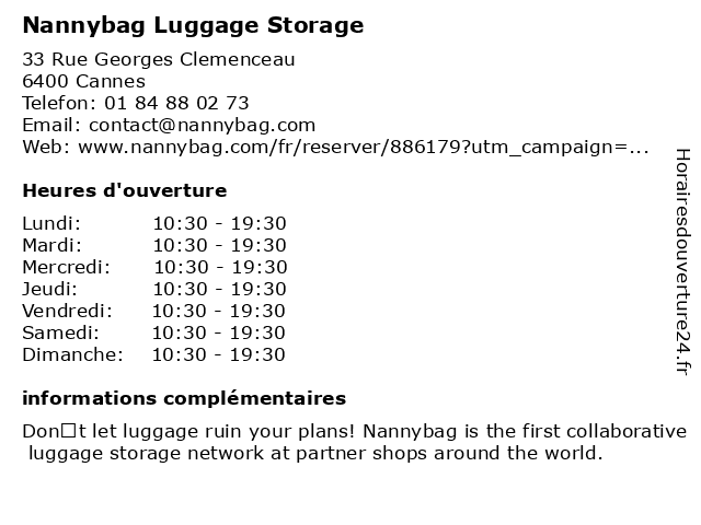 1 Nannybag Luggage Storage (Distance: 1,03 km) 2 Rue Louis Braille, 06400 Cannes luggage, nannybag, storage 2 Nannybag Luggage Storage (Distance: 1,06 km) 47 Boulevard Carnot, 06400 Cannes luggage, nannybag, storage 3 Nannybag Luggage Storage (Distance: 1,23 km) 44 Bd De La République, 06400 Cannes luggage, nannybag, storage 4 Nannybag Luggage Storage (Distance: 1,23 km) 1 Rue Marcellin Berthelot, 06400 Cannes luggage, nannybag, storage 5 Nannybag Luggage Storage (Distance: 2,28 km) 1400 Av. Du Campon, 06110 Le Cannet luggage, nannybag, storage 6 Nannybag Luggage Storage (Distance: 2,71 km) 76 Avenue Francis Tonner, 06150 Cannes luggage, nannybag, storage |