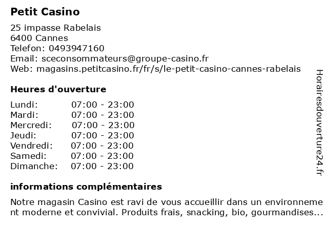1 Petit Casino (Distance: 0,73 km) 7 Place Stanislas, 06400 Cannes alimentation, casino, fruits, légumes, petit, superette, supermarché 2 Petit Casino (Distance: 2,15 km) 30 Avenue de Lérins, 06400 Cannes alimentation, casino, fruits, légumes, petit, superette, supermarché 3 Petit Casino (Distance: 8,06 km) 50 Route de Saint-Jean, 06600 Antibes alimentation, boisson, by, casino, petit, superettes, épicerie 4 Petit Casino (Distance: 16,03 km) - Grande Rue, 83600 Les Adrets-de-l'Estérel alimentation, casino, fruits, fégumes, marché, petit, superette, épicerie 5 Petit Casino (Distance: 19,23 km) 353-357 Avenue du Général Leclerc, 06700 Saint-Laurent-du-Var alimentation, casino, fruits, legumes, petit, superette, épicerie 6 Casino Shop (Distance: 0,14 km) 19 Boulevard Carnot, 06110 Le Cannet alimentation, casino, fruits, fégumes, marché, shop, superette, épicerie |