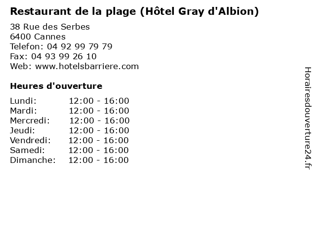 1 Hôtel Gray d'Albion (Distance: 0,00 km) 38 Rue des Serbes, 06400 Cannes chambre, d'albion, gray, hebergement, hotel, hôtel 2 Le Bar du Gray (Hôtel Gray d'Albion) (Distance: 0,00 km) 38 Rue des Serbes, 06400 Cannes bar, cuisine, d'albion, du, gray, hôtel, le, restaurant, restauration 3 Parking Interparking Coeur Croisette - Gray d'Albion (Distance: 0,02 km) 38 Rue des Serbes, 06400 Cannes abonnement parking, abonnement voitures, aire de parking, aire de stationnement, car-park, coeur, croisette, d'albion, gray, interparking, parc de stationnement, parking, parking couvert, parking payant, parking sécurisé sous surveillance, parking véhicules, places de stationnement payant, pmr, stationnement voiture 4 HÔTEL BARRIÈRE LE GRAY D' ALBION CANNES (Distance: 0,02 km) 38 rue Serbes, 06400 Cannes albion, barriÈre, cannes, d', gray, hÔtel, le 5 Onepark / Gray D'Albion Parking (Distance: 0,04 km) 15 Rue des serbes, 06400 Cannes d'albion, gray, onepark, parking, services 6 Salon du Gray (Distance: 0,07 km) 64 rue d’Antibes, 06400 Cannes beauté, coiffure, coiffures, coloristes, du, gray, salon |