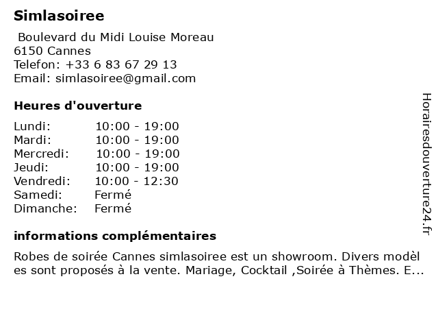 Robes de soirée Cannes simlasoiree est un showroom. Divers modèles sont proposés à la vente. Mariage, Cocktail ,Soirée à Thèmes. Essayages possibles uniquement sur rendez vous. Livraison pos...