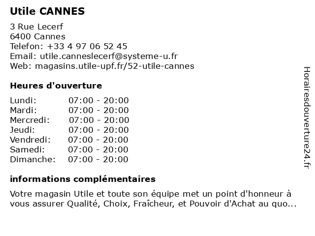 1 UTILE CANNES Félix Faure (Distance: 0,85 km) 69 Rue Félix Faure, 06400 Cannes cannes, faure, félix, utile 4 Utile Supermarché (Distance: 6,65 km) 114 Boulevard Raymond Poincaré, 06160 Juan-les-Pins alimentation, supermarché, supérette, utile, épicerie 6 |
