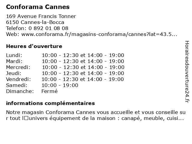 2 Conforama - Dépôt 2 (Distance: 10,60 km) 21 rue Henri Laugier, 06600 Antibes ameublement, conforama, décoration, dépôt, maison, meubles 3 Dépôt 2 Conforama Antibes (Distance: 10,62 km) 21 Rue henri laugier, 06600 Antibes antibes, conforama, dépôt, magasin d'ameublement et de décoration, magasin d'informatique, magasin d'électroménagers, magasin de literie, magasin de luminaires, magasin de tapis, réaménagement de cuisines 4 Conforama (Distance: 11,11 km) 2727 Chemin de Saint-Claude, 06600 Antibes ameublement, conforama, décoration, meubles 5 Conforama Antibes (Distance: 11,12 km) 2727 Chemin de saint-claude, 06600 Antibes antibes, conforama, magasin d'ameublement et de décoration, magasin d'informatique, magasin d'électroménagers, magasin de literie, magasin de luminaires, magasin de tapis, réaménagement de cuisines 6 Dépôt 2 Conforama Villeneuve-Loubet (Distance: 15,79 km) 245 Avenue Des Maurettes, 06270 Villeneuve-Loubet conforama, dépôt, loubet, magasin d'ameublement et de décoration, magasin d'informatique, magasin d'électroménagers, magasin de literie, magasin de luminaires, magasin de tapis, réaménagement de cuisines, villeneuve |