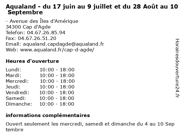 1 Aqualand - du 10 juillet au 27 Août (Distance: 0,00 km) - Avenue des Îles d'Amérique, 34300 Cap d'Agde 10, 27, août, aqualand, aquatique, au, centre, du, juillet, loisirs 2 La Cure Gourmande (Juillet & Août) (Distance: 1,55 km) - Place Agde Marine, 34300 Cap d'Agde août, biscuits, cadeaux, chocolat, confiserie, cure, gourmande, juillet, la 3 Aquarium Marin du Cap d’Agde - Juillet et août (Distance: 1,56 km) 11 rue des 2 Frères, 34300 Cap d’Agde août, aquarium, boutique, cap, du, d’agde, et, juillet, marin, poisson, visite 4 Musée de l’Ephèbe - Juillet et Août (Distance: 2,15 km) - de la Clape, 34300 Agde août, de, et, exposition, juillet, l’ephèbe, musée, visite 5 Camping l'Air Marin - Juillet-Août (Distance: 6,02 km) - Chemin des Œillets, 34450 Vias août, camping, en, juillet, l'air, loisirs, marin, réception, tourisme, vacances 6 Camping Club Le Napoléon - Réception Juillet et Août (Distance: 6,47 km) 1171 avenue de la Méditerranée, 34450 Vias août, camping, club, et, haute, juillet, juillet/aout, le, loisirs, napoleon, napoléon, réception, saison, tourisme, vacances |