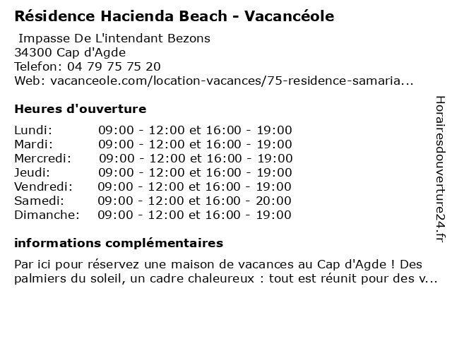 1 Résidence Savanna Beach / Les Terrasses de Savanna - Vacancéole (Distance: 0,40 km) Impasse Du Cormoran, 34300 Cap d'Agde beach, de, les, résidence, savanna, terrasses, vacancéole 2 Jungle Beach (Distance: 0,73 km) . rue des Corsaires, 34300 Agde activité, beach, cocktails, jungle, plage, privé, restaurant, restauration 3 Bianca Beach (Distance: 0,73 km) . rue des Corsaires, 34300 Agde activité, beach, bianca, cocktails, plage, privé, restaurant, restauration 4 Résidence La Baie des Anges - Vacancéole (Distance: 0,90 km) Impasse Des Sargasses, 34300 Le Cap D'Agde anges, baie, des, la, résidence, vacancéole 5 Le Palm Beach Plage (Distance: 1,40 km) . Chemin du Littoral Prolongé, 34300 Le Grau-d'Agde activité, beach, cocktails, le, palm, plage, privé, restaurant, restauration 6 Résidence le Saint-Clair** - Vacancéole (Distance: 2,34 km) 4 Impasse De La Misaine, 34300 Le Cap D'Agde clair**, le, résidence, saint, vacancéole |