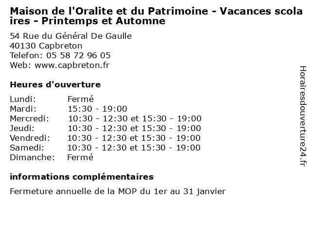 | Mercredi | 10:30-12:30 et 15:30-19:00 |