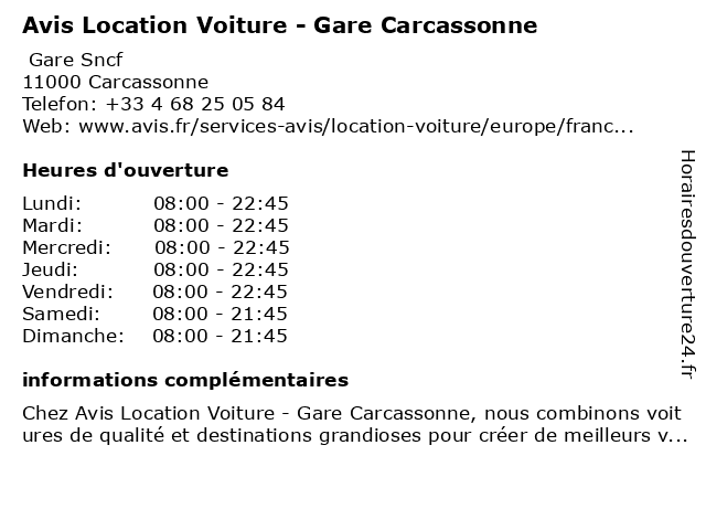 1 Gare de Carcassonne (Distance: 0,01 km) 1 Avenue Maréchal Joffre, 11000 Carcassonne carcassonne, commun, de, en, ferroviaire, gare, sncf, ter, tgv, train, transports 2 Gare de Carcassonne - Guichet (Distance: 0,01 km) 1 Avenue Maréchal Joffre, 11000 Carcassonne carcassonne, commun, de, en, ferroviaire, gare, guichet, sncf, ter, tgv, train, transports 3 Avis (Distance: 0,01 km) - Gare Sncf, 11000 Carcassonne avis, location de camions, location de voitures, services, voitures 4 Parking Gare de Carcassonne - EFFIA (Distance: 0,03 km) Avenue Maréchal Joffre, 11000 Carcassonne carcassonne, de, effia, gare, parking 5 Grande Pharmacie de la Gare (Distance: 0,23 km) 9 , Boulevard Omer Sarraut, 11000 Carcassonne de, gare, grande, la, la médecine, la pharmacie, la santé, les soins, pharmacie 6 Grande Pharmacie de la Gare (Distance: 0,23 km) 9 Boulevard Omer Sarraut, 11000 Carcassonne de, gare, grande, herboristerie, la, médicaments, paramédical, parapharmacie, pharmacie, pharmacien, santé, traitements |