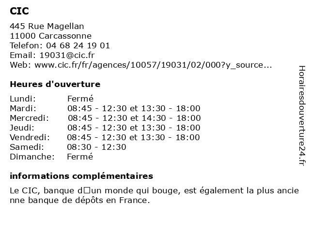 1 CIC (Distance: 2,88 km) 46 Rue De Verdun, 11000 Carcassonne cic, compagnie de téléphone, organisme d'assurance 2 CIC (Distance: 5,65 km) Boulevard Henry Bouffet, 11000 Carcassonne cic, compagnie de téléphone, organisme d'assurance 3 Crédit Industriel et Commercial (CIC) (Distance: 5,77 km) . Boulevard Henry Bouffet, 11000 Carcassonne agence, argent, assurance, bancaire, banque, cic, commercial, conseil, credit, crédit, et, finance, industriel, patrimoine 4 CIC Castres (Distance: 28,26 km) 3 Cours Rene Reille, 81200 Mazamet castres, cic, compagnie de téléphone, organisme d'assurance 5 CIC (Distance: 50,49 km) Route De Perpignan, 11100 Narbonne cic, compagnie de téléphone, organisme d'assurance 6 Crédit Industriel et Commercial (CIC) (Distance: 50,59 km) - Route de Perpignan, 11100 Narbonne agence, argent, assurance, bancaire, banque, cic, commercial, conseil, credit, crédit, et, finance, industriel, patrimoine  |