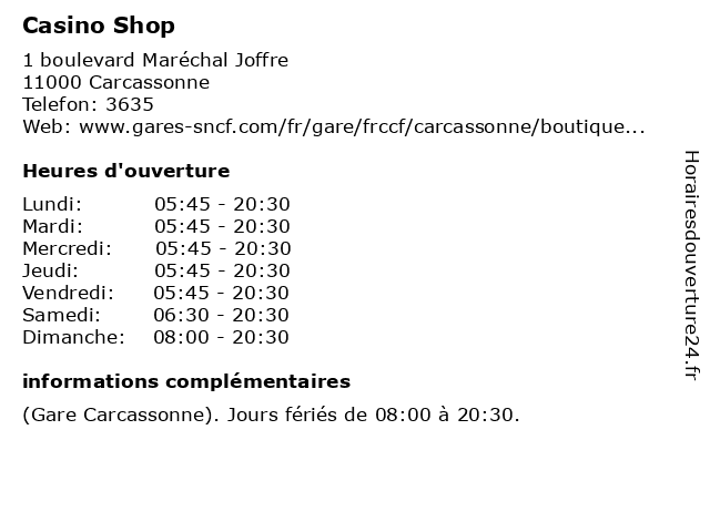 1 Vival By Casino (Distance: 1,26 km) 112 Avenue General Leclerc, 11000 Carcassonne by, casino, droguerie, d’hypermarchés, frais, fruits et légumes, hygiène, parfumerie et autres produits non alimentaires., surgelés, vival, épicerie 2 Géant Casino Station Service (Distance: 2,79 km) 2 Avenue du Souvenir Français, 11000 Carcassonne automobiles, casino, géant, oil, service, services, station, stations essences 3 Casino Station Service (Distance: 2,86 km) - ZI la Bouriette, 11000 Carcassonne carburant, casino, essences, gazole, service, services, station 4 Casino Drive (Distance: 3,14 km) . Avenue Du Souvenir Francais, 11069 Carcassonne beaute, bio, casino, drive, hygiene, supermarche 5 Géant Casino Station Service (Distance: 3,50 km) . Boulevard Henry Bouffet, 11000 Carcassonne automobiles, casino, géant, oil, service, services, station, stations essences 6 Casino Drive (Distance: 3,70 km) . zi La Bouriette, 11000 Carcassonne beaute, bio, casino, drive, hygiene, supermarche |