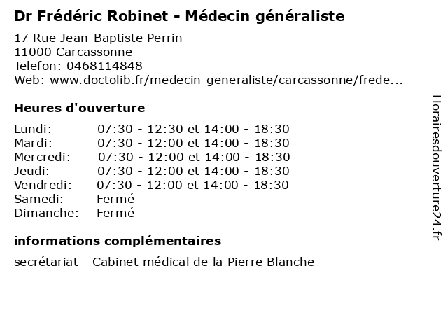 | Lundi | 07:30-12:30 et 14:00-18:30 |