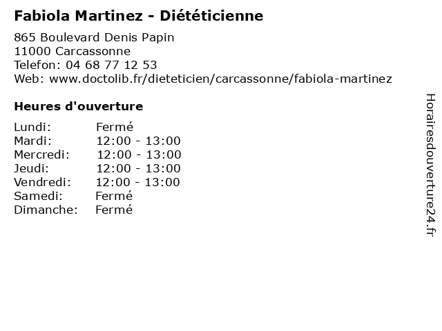 1 Dr Catherine Martinez - Médecin généraliste (Distance: 1,01 km) 13 Rue des Pyrénées, 11000 Carcassonne catherine, docteur, dr, generaliste, généraliste, martinez, medical, médecin, soin 2 Laura Tajan - Diététicienne (Distance: 1,28 km) 12 Rue Antoine Watteau, 11000 Carcassonne alimentation, dieteticien, diététicienne, laura, nourriture, sante, tajan 3 Laura Tajan - Diététicienne (Distance: 1,28 km) 12 Rue Antoine Watteau, 11000 Carcassonne actes et symptômes, diététicienne, expertises, laura, nutrition du sportif, tajan, éducation au diabète 4 Émilie Paredes-Menassi - Diététicienne (Distance: 2,33 km) 87 Rue du Dr Albert Tomey, 11000 Carcassonne bien, diététicien, diététicienne, diététiciens, menassi, nutrition, paredes, s'alimenter, Émilie 5 CH Carcassonne - Radiotherapie / Dr Martinez (Distance: 5,75 km) 1060 Chemin de la Madeleine, 11010 Carcassonne , bureau, carcassonne, ch, consultation, dr, maladie, martinez, med, médecin, médecine, pratique, radiotherapie, thérapie, traitement 6 Brigitte Goyet - Diététicienne (Distance: 6,01 km) 1060 Chemin de la Madeleine, 11000 Carcassonne brigitte, consultation, dieteticien, diététicienne, docteur, goyet, med, médecin, médecine, traitement |