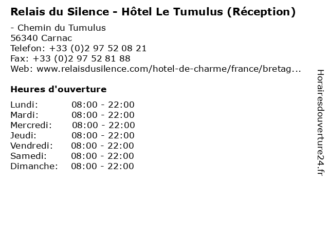1 Relais du Silence - Hôtel Le Tumulus (Accès) (Distance: 0,00 km) - Chemin du Tumulus, 56340 Carnac accès, du, hebergement, hotel, hôtel, le, relais, silence, tourisme, tumulus 2 Relais du Silence - Hôtel Le Tumulus (Restaurant, Février/mars et octobre/novembre) (Distance: 0,00 km) - Chemin du Tumulus, 56340 Carnac du, et, février/mars, hebergement, hotel, hôtel, le, octobre/novembre, relais, restaurant, silence, tourisme, tumulus 3 Relais du Silence - Hôtel Le Tumulus (Restaurant, avril à septembre) (Distance: 0,00 km) - Chemin du Tumulus, 56340 Carnac avril, du, hebergement, hotel, hôtel, le, relais, restaurant, septembre, silence, tourisme, tumulus 4 Les Menhirs (réception - Basse saison) (Distance: 1,32 km) - Allée Saint Michel, 56340 Carnac basse, camping, centre de vacances, hébergements, les, location, menhirs, réception, saison, tourisme 5 Les Menhirs (réception - Haute saison) (Distance: 1,32 km) - Allée Saint Michel, 56340 Carnac camping, centre de vacances, haute, hébergements, les, location, menhirs, réception, saison, tourisme 6 Camping Domaine de Kermario - Tohapi (Réception, basse saison) (Distance: 1,48 km) 1 chemin de Kerluir, 56340 Carnac basse, camping, de, domaine, hebergement, kermario, réception, saison, tohapi, tourisme |