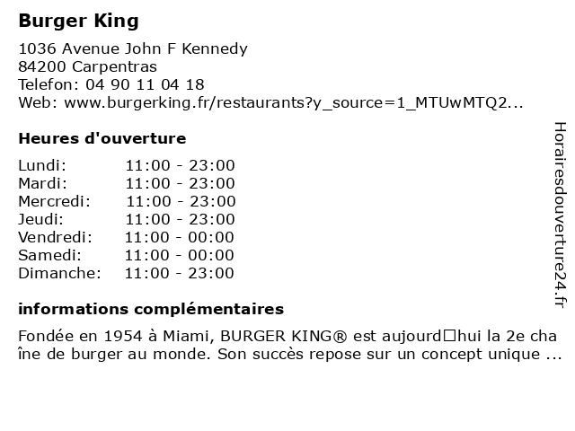 1 Burger King (Distance: 14,14 km) 342 Avenue Louis Braille, 84130 Le Pontet bar & gril, burger, king, restaurant américain, restaurant de hamburgers, restaurant familial, restaurant à emporter 2 Burger King (Distance: 17,02 km) Rue Carignan, 84100 ORANGE bar & gril, burger, king, restaurant américain, restaurant de hamburgers, restaurant familial, restaurant à emporter 3 Burger King (Distance: 19,26 km) 160 Rue Eric Rohmer, 84000 Avignon bar & gril, burger, king, restaurant américain, restaurant de hamburgers, restaurant familial, restaurant à emporter 4 Burger King - Salle (Distance: 0,01 km) 1036 Avenue John F Kennedy, 84200 Carpentras burger, burgers, fast, food, king, rapide, restaurant, restauration, salle 5 Burger King - Drive (Distance: 0,01 km) 1036 Avenue John F Kennedy, 84200 Carpentras burger, burgers, drive, fast, food, king, rapide, restaurant, restauration 6 Italia King (Distance: 0,95 km) 425 Avenue Frédéric Mistral, 84200 Carpentras fast, food, italia, king, pizza, pizzeria, restaurant, restauration |