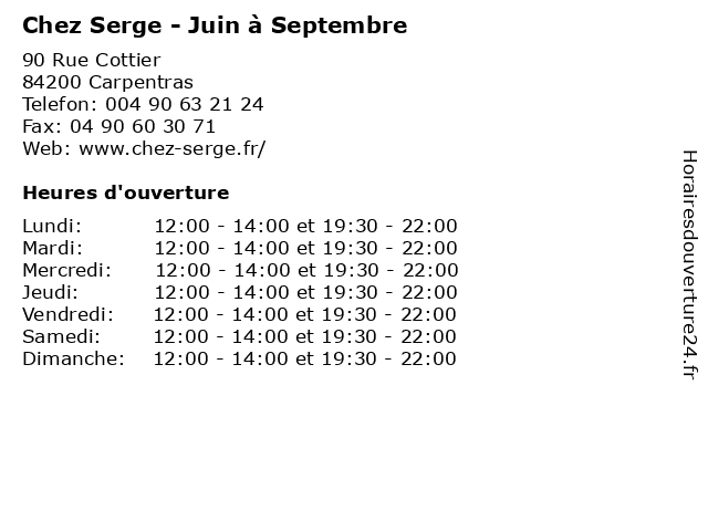 | Mercredi | 12:00-14:00 et 19:30-22:00 |