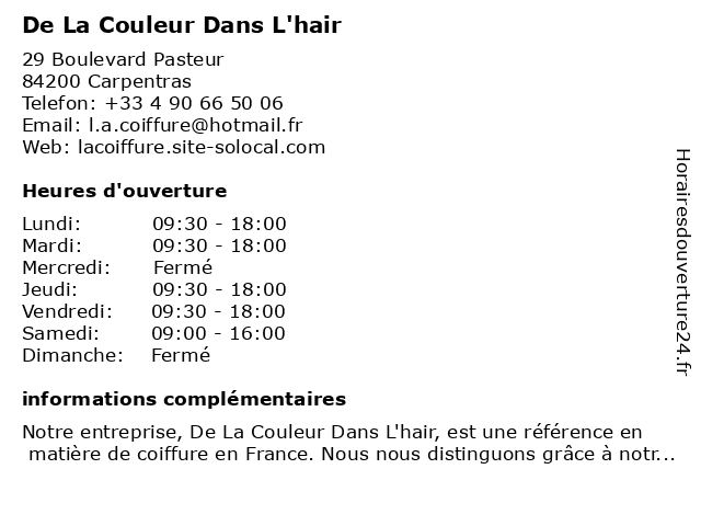 2 Nouvel'Hair Coiffure (Distance: 14,01 km) 212 route de Châteauneuf, 84350 Courthézon balayage, coiffeur, coiffure, coloration, coupe, mèche, nouvel'hair, soins 4 Planet'Hair (Distance: 16,21 km) Avenue de l'Europe, 84270 Vedène beauté, cheveux, coiffeur, coiffure, coupe, expert, planet'hair, salon, soins, visagiste 5 Just Hair (Distance: 18,93 km) - Route Royale, 84100 Orange beauté, coiffeur, coiffure, hair, just, salon 6 La Chambr' A Hair (Distance: 19,42 km) 111 avenue Charles de Gaulle, 84130 Le Pontet barbe, barbier, beauté, chambr, chambr', coiffeur, coiffure, hair, la, mixte, salon |