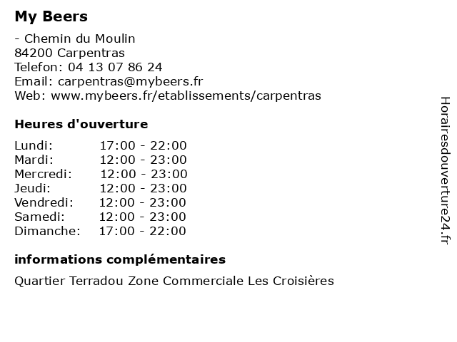 1 My Beers (Distance: 13,95 km) 79 allée de la Tramontane, 84250 Le Thor alcool, bar, beers, bière, bières, boissons, brasserie, débit, my, pressions 2 MY DOG Toilettage canin félin (Distance: 1,55 km) 290 Avenue Jean Jaurès, 84200 Carpentras canin, dog, félin, my, toilettage 3 Moliner - Enjoy My Home (Distance: 10,81 km) route d'Avignon, 84320 Entraigues-sur-la-Sorgue enjoy, fenêtres, fermetures, home, installation, menuiserie, moliner, my, portes, rénovation, stores 5 My Only Bien-Être - Messages et soins énergétiques (Distance: 12,03 km) 30 Avenue de Rascassa, 84370 Bédarrides bien, et, messages, my, only, soins, Être, énergétiques 6 |