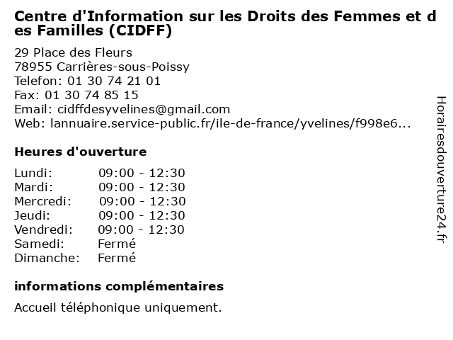 1 Centre d'Information sur les Droits des Femmes et des Familles (CIDFF) (Distance: 11,13 km) - Immeuble Ordinal, 95000 Cergy administration, assoc, centre, cidff, d'information, des, droits, et, familles, femmes, les, services, services publics, sur 2 Centre d'Information sur les Droits des Femmes et des Familles (CIDFF) (Distance: 15,73 km) 71 Rue des Fontenelles, 92000 Nanterre administration, assoc, centre, cidff, d'information, des, droits, et, familles, femmes, les, services, services publics, sur 3 Centre D'Information sur les Droits des Femmes et des Familles (Distance: 0,02 km) 22 Place des Fleurs, 78955 Carrières-sous-Poissy administration, assoc, centre, d'information, des, droits, et, familles, femmes, les, services, services publics, sur 4 Halte Garderie de Marsinval Vernouillet - Horaires de Villennes sur Seine (Distance: 4,12 km) n/a Domaine de Marsinval, 78540 Vernouillet caregivers houses, child care, de, family home, garderie, halte, home care, horaires, kindergartens, marsinval, micro-nurseries, parental home, seine, sur, vernouillet, villennes 5 Multi Accueil Maison de l'enfance « Sur un nuage » (Distance: 8,05 km) 50/52 Rue Roger Salengro, 78360 Montesson accueil, caregivers houses, child care, de, family home, home care, kindergartens, l'enfance, maison, micro-nurseries, multi, nuage, parental home, sur, un 6 Cedeo (Informations sur le showroom) (Distance: 8,47 km) 21 Rue Charles de Gaulle, 78560 Le Port-Marly cedeo, heating materials, informations, le, plumbing, showroom, sur |