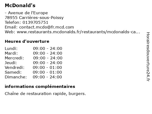 1 McDonald's (Distance: 0,99 km) 104 Rue du Général de Gaulle, 78300 Poissy burgers, fast, food, hamburgers, mcdonald's, rapide, restaurant, restauration 2 McDonald's (Distance: 3,24 km) - ZAC du Chemin Neuf, 78260 Achères burgers, fast, food, hamburgers, mcdonald's, rapide, restaurant, restauration 3 McDonald's (Distance: 6,17 km) - Aire de Morainvilliers, 78630 Morainvilliers burgers, fast, food, hamburgers, mcdonald's, rapide, restaurant, restauration 4 McDonald's (Distance: 11,91 km) 21 Boulevard de l'Oise, 95000 Cergy-Pontoise burgers, fast, food, hamburgers, mcdonald's, rapide, restaurant, restauration 5 McDonald's (Distance: 12,62 km) 46 Rue Du Château, 92500 Rueil-Malmaison burgers, fast, food, hamburgers, mcdonald's, rapide, restaurant, restauration 6 McDonald's (Distance: 13,17 km) - ZAC du Moulin à Vent, 95650 Puiseux-Pontoise burgers, fast, food, hamburgers, mcdonald's, rapide, restaurant, restauration |