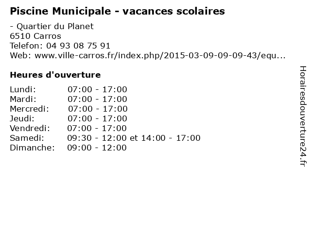 1 Piscine Municipale - vacances scolaires (Distance: 11,86 km) - Boulevard Honoré Teisseire, 06480 La Colle-sur-Loup aqua, aquatique, les, municipale, pendant, piscine, scolaires, vacances 2 Piscine Municipale - septembre à juin (Période scolaire) (Distance: 0,00 km) - Quartier du Planet, 06510 Carros aqua, aquatique, juin, municipale, piscine, période, scolaire, septembre 3 Piscine Municipale - vacances d'été (Distance: 0,00 km) - Quartier du Planet, 06510 Carros aqua, aquatique, d'été, municipale, piscine, vacances 4 Piscine Soleil Service (Distance: 1,52 km) 890 Boulevard du Mercantour, 06200 Nice piscine, service, soleil 5 Espace Jeunes (Périodes Scolaires) (Distance: 1,71 km) 53 Rue Virgil Barel, 06510 Gattières activités, espace, jeunes, loisirs, période, périodes, scolaire, scolaires 6 Espace Jeunes (Vacances Scolaires) (Distance: 1,71 km) 53 Rue Virgil Barel, 06510 Gattières activités, espace, jeunes, loisirs, scolaires, vacances |