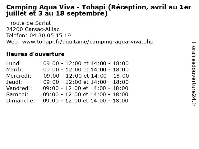 1 Camping Aqua Viva - Tohapi (Réception, 2 juillet au 2 septembre) (Distance: 0,00 km) - route de Sarlat, 24200 Carsac-Aillac aqua, au, camping, hebergement, juillet, réception, septembre, tohapi, tourisme, viva 2 Camping Aqua Viva - Tohapi (Distance: 0,00 km) - route de Sarlat, 24200 Carsac-Aillac aqua, camping, hebergement, tohapi, tourisme, viva 3 Hydro Sud (du 18/04/2015 au 19/09/2015) (Distance: 1,70 km) . Avenue de la Dordogne, 24200 Sarlat-La-Canéda 18/04/2015, 19/09/2015, au, construction piscines, du, filtre, hydro, loisirs, sud 4 Château de Castelnaud - Juillet, août (Distance: 9,63 km) - Castelnaud-la-Chapelle, 24250 Castelnaud-la-Chapelle ancien, août, art, castelnaud, chateau, château, de, juillet, musee 5 Camping Le Mas - Tohapi (Réception, haute saison) (Distance: 12,35 km) - sireuil, 24620 Les Eyzies De Tayac Sireuil camping, haute, hebergement, le, mas, réception, saison, tohapi, tourisme 6 Camping Le Mas - Tohapi (Réception, basse saison) (Distance: 12,35 km) - sireuil, 24620 Les Eyzies De Tayac Sireuil basse, camping, hebergement, le, mas, réception, saison, tohapi, tourisme |
