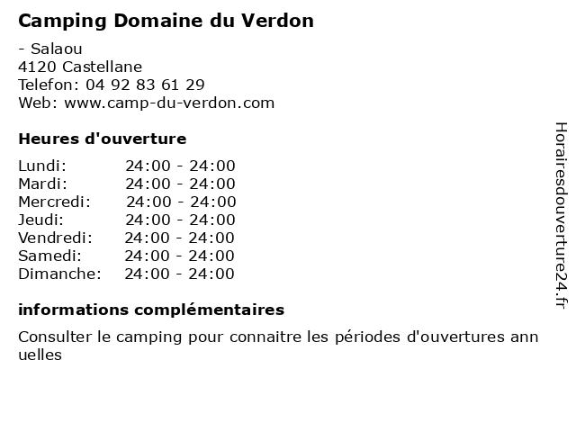 1 Camping Domaine du Verdon (Pizzeria, juillet et août) (Distance: nan km) - Salaou, 04120 Castellane août, camping, domaine, du, et, hebergement, juillet, pizzeria, tourisme, verdon 2 Camping Domaine du Verdon (Restaurant) (Distance: nan km) - Salaou, 04120 Castellane camping, domaine, du, hebergement, restaurant, tourisme, verdon 3 Camping Domaine du Verdon (Réception haute saison) (Distance: nan km) - Salaou, 04120 Castellane camping, domaine, du, haute, hebergement, réception, saison, tourisme, verdon 4 Camping Domaine du Verdon (Réception basse saison) (Distance: nan km) - Salaou, 04120 Castellane basse, camping, domaine, du, hebergement, réception, saison, tourisme, verdon 5 Communauté de Communes du Moyen Verdon (Distance: 1,56 km) 126 Avenue Frédéric Mistral, 04120 Castellane administration, communauté, communes, de, du, moyen, services publics, verdon 6 Collège du Verdon (Distance: 1,66 km) - Rue du 11 novembre, 04120 Castellane centre, collège, de, documentation, du, d’information, education, et, public, service, verdon |