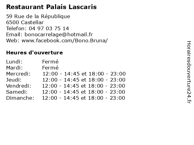 | Dimanche | 12:00-14:45 et 18:00-23:00 |