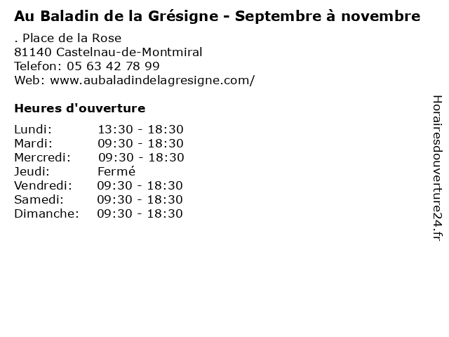 1 Au Baladin de la Grésigne - Juillet à septembre (Distance: 0,00 km) . Place de la Rose, 81140 Castelnau-de-Montmiral au, baladin, bouquinerie, de, gresigne, grésigne, juillet, la, restauration, salon de thé, septembre 2 Château-musée du Cayla - De 2 mai au 30 juin et du 1er septembre au 31 octobre (Distance: 7,92 km) - Le Cayla, 81140 Andillac 1er, 30, 31, au, cayla, château, de, du, et, exposition, juin, mai, musée, octobre, septembre, visite 3 Stations Bee's - Horaire De Septembre à Mai (Distance: 9,57 km) 11 rue Aristide Briand, 81600 Gaillac bee's, de, horaire, location, mai, septembre, stations, stations bee's, vélos 4 Muséum d'Histoire Naturelle - De novembre à mars (Distance: 9,57 km) 2 place Philadelphe Thomas, 81600 Gaillac d'histoire, de, exposition, mars, musée, muséum, naturelle, novembre, visite 5 Musée de l'Abbaye - Avril à Septembre (Distance: 9,81 km) - Place Saint-Michel, 81600 Gaillac 1er, 30, 31, août, au, avril, de, du, exposition, juillet, juin, l'abbaye, musée, septembre, visite 6 L'Auberge du Lac (Juin à Mi-Septembre) (Distance: 11,91 km) - Impasse du bord du Lac, 81310 Lisle-sur-Tarn auberge, brasserie, coquelicot, du, juin, l', l'auberge, lac, mi, restaurants, restauration, septembre |