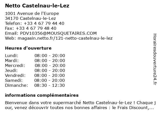 1 Netto Station Service (Distance: 0,99 km) 1001 Avenue de l'Industrie, 34170 Castelnau-le-Lez carburant, essences, gazole, netto, service, services, station 4 6 Netto (Distance: 10,65 km) - Route de Nîmes, 34400 Lunel achats de produits alimentaires, des prix bas, grands supermarchés, hard discount, netto, supermarchés |