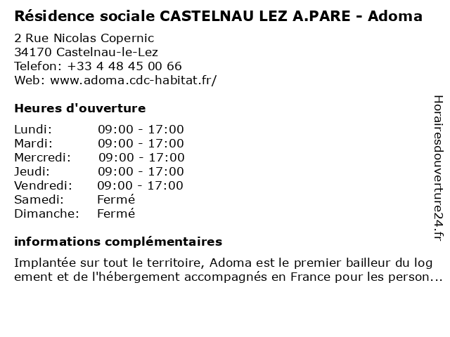 Termes de recherche pour Résidence sociale CASTELNAU LEZ A.PARE - Adoma:castelnau, lez, résidence, sociale, adoma, a.pare |