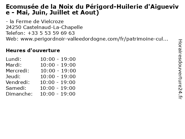 1 Ecomusée de la Noix du Périgord-Huilerie d'Aiguevive - Avril, Sept, Oct, Nov) (Distance: 0,00 km) - la Ferme de Vielcroze, 24250 Castelnaud-La-Chapelle avril, d'aiguevive, de, du, ecomusée, exposition, huilerie, la, musée, noix, nov, oct, ouvert, périgord, sept, visite 2 Château de Castelnaud - Juillet, août (Distance: 0,53 km) - Castelnaud-la-Chapelle, 24250 Castelnaud-la-Chapelle ancien, août, art, castelnaud, chateau, château, de, juillet, musee 3 Château de Castelnaud - Juillet, août (spectacle-enquête les lundis, mardis et mercredis) (Distance: 0,53 km) - Castelnaud-la-Chapelle, 24250 Castelnaud-la-Chapelle ancien, août, art, castelnaud, chateau, château, de, enquête, et, juillet, les, lundis, mardis, mercredis, musee, spectacle 4 La Maison De La Noix (Distance: 2,22 km) - La Borie, 24250 Cénac-et-Saint-Julien alimentation, boutique, confitures, de, dégustation, huiles, la, maison, noix 5 Office de Tourisme - Juillet et Août (Distance: 3,02 km) - La Balme, 24220 Beynac et Cazenac août, de, et, horaires des musées, juillet, office, restaurants, tourisme, transports 6 Office de Tourisme - Avril à Juin et Septembre (Distance: 3,02 km) - La Balme, 24220 Beynac et Cazenac avril, de, et, horaires des musées, juin, mai, office, restaurants, septembre, tourisme, transports |