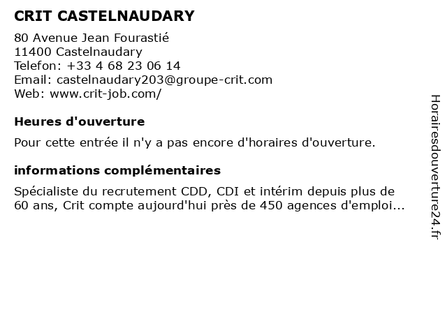 4 CRIT TOULOUSE Experts & Cadres (Distance: 46,02 km) 445 L'Occitane, 31670 Labege cadres, crit, experts, toulouse 5 CRIT TOULOUSE BTP 2nd oeuvre Maintenance (Distance: 53,26 km) 60 Rue Benjamin Baillaud, 31500 Toulouse 2nd, btp, crit, maintenance, oeuvre, toulouse 6 |