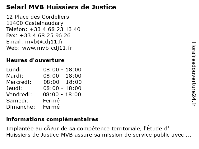 1 Selarl MVB Huissiers de Justice (Distance: 0,00 km) 12 Place des Cordeliers, 11400 Castelnaudary de, huissiers, justice, mvb, selarl 2 Selarl MVB Huissiers de Justice (Distance: 0,00 km) 12 Place des Cordeliers, 11400 Castelnaudary de, huissiers, justice, mvb, selarl 3 Selarl MVB Huissiers de Justice (Distance: 0,00 km) 12 Place des Cordeliers, 11400 Castelnaudary de, huissiers, justice, mvb, selarl 4 Maître Brignet Romain - Huissier de justice (Distance: 0,18 km) 35 Place De Verdun, 11400 Castelnaudary brignet, constat, de, huissier, justice, maître, recouvrement, romain, sommation, étude 5 Point d'accès au Droit-Huissiers de justice (Distance: 21,61 km) 132 Rue de la République, 31290 Villefranche De Lauragais au, d'accès, de, droit, huissiers, justice, point, public, services 6 Bayle & Lefebvre - Huissiers de justice (Distance: 34,36 km) 10 rue du Palais, 11000 Carcassonne bayle, citoyen, de, huissier, huissiers, justice, lefebvre, lois |