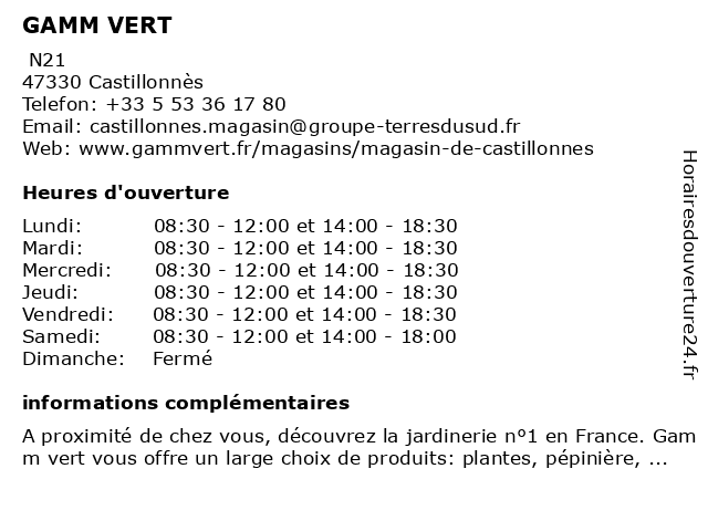 1 Gamm vert (Distance: 10,67 km) Lotissement du Parc, 47410 Saint-Colomb-de-Lauzun animalerie, gamm, jardin, jardinerie, mobilier de jardin, plantes, pépinière, vert 2 Gamm vert (Distance: 11,04 km) Lieu-dit Le Bourg, 47290 Cancon animalerie, gamm, jardin, jardinerie, mobilier de jardin, plantes, pépinière, vert 3 Gamm vert (Distance: 11,14 km) - Route de Monbahus, 47290 Cancon animalerie, animaux, gamm, horticulteur, jardin, jardinerie, vert 4 Gamm vert (Distance: 11,57 km) Avenue Bernard Palissy, 47210 Villeréal animalerie, gamm, jardin, jardinerie, mobilier de jardin, plantes, pépinière, vert 5 Gamm vert (Distance: 14,19 km) N21, 24560 Bouniagues animalerie, gamm, jardin, jardinerie, mobilier de jardin, plantes, pépinière, vert 6 GAMM VERT (Distance: 17,54 km) Avenue de Mondésir, 47150 Monflanquin animalerie, gamm, jardin, jardinerie, mobilier de jardin, plantes, pépinière, vert |