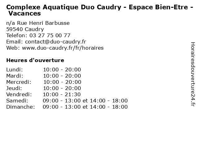 1 Complexe Aquatique Duo Caudry - Espace Aquatique - Périodes Normales (Distance: 0,00 km) n/a Rue Henri Barbusse, 59540 Caudry activité, aquatique, bassins, caudry, complexe, duo, espace, famille, natation, normale, normales, piscine, périodes, scolaire, scolaires, sport 2 Complexe Aquatique Duo Caudry - Espace Aquatique - Vacances (Distance: 0,00 km) n/a Rue Henri Barbusse, 59540 Caudry activité, aquatique, bassins, caudry, complexe, duo, espace, famille, natation, petites, piscine, scolaire, scolaires, sport, vacances, vacancess 3 Complexe Aquatique Duo Caudry - Espace Forme - Périodes scolaires (Distance: 0,05 km) - Rue Henri Barbusse, 59540 Caudry activité, aquatique, bassins, caudry, complexe, duo, espace, famille, forme, natation, piscine, périodes, scolaire, scolaires, sport 4 Complexe Aquatique Duo Caudry - Espace Forme - Petites vacances scolaires (Distance: 0,05 km) - Rue Henri Barbusse, 59540 Caudry activité, aquatique, bassins, caudry, complexe, duo, espace, famille, forme, natation, petites, piscine, scolaire, scolaires, sport, vacances 5 Complexe Aquatique Duo Caudry - Espace Forme - Vacances d'été (Distance: 0,05 km) - Rue Henri Barbusse, 59540 Caudry activité, aquatique, bassins, caudry, complexe, d'été, duo, espace, famille, forme, natation, piscine, sport, vacances 6 Complexe Aquatique Duo - Espaces Aquatique/Bien-être/Forme - Eté (Distance: 10,36 km) n/a Avenue Simone Veil, 59360 Le Cateau-Cambrésis aquatique, aquatique/bien, bassins, bien, complexe, duo, espace, espaces, estivale, eté, forme, piscine, piscines, sports, être, être/forme |