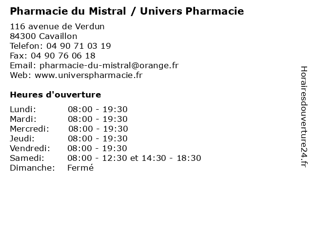 | Lundi | 08:00-19:30 |