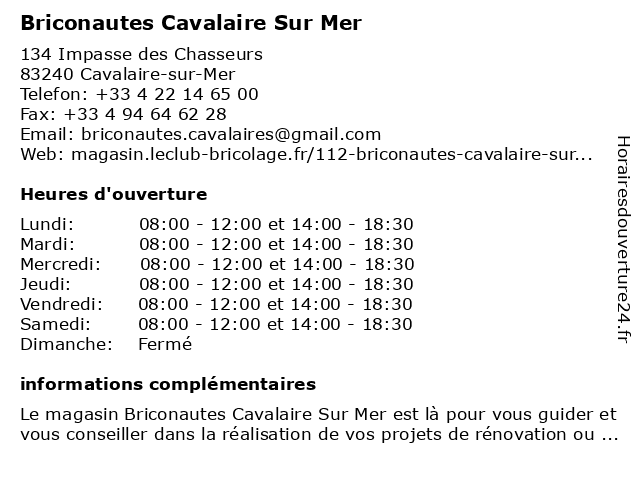 1 Les Briconautes - Eté (Distance: 0,46 km) n/a Route de Toulon, 83240 CAVALAIRE briconautes, carpentry, decoration, electricity, eté, garden, hardware store, les, outdoors, sanitary, tools 2 Les Briconautes - Hiver (Distance: 0,46 km) n/a Route de Toulon, 83240 CAVALAIRE briconautes, carpentry, decoration, electricity, garden, hardware store, hiver, les, outdoors, sanitary, tools 4 Briconautes Salernes (Distance: 48,98 km) 9 Boulevard de la Libération, 83690 Salernes briconautes, salernes |