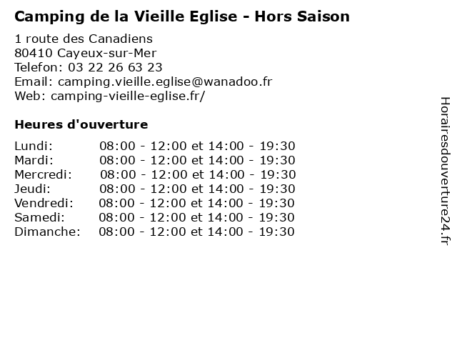 1 Camping de la Vieille Eglise - Période estivale (Distance: 0,00 km) 1 route des Canadiens, 80410 Cayeux-sur-Mer accueil, camping, de, eglise, en, estivale, la, loisirs, période, tourisme, vacances, vieille 2 Camping Le Bois des Pins - Réception Haute Saison (Distance: 3,18 km) - Rue Guillaume Le Conquérant, 80410 Cayeux-sur-Mer bois, camping, caravaning, des, haute, le, mobil home, pins, réception, saison, séjour, tourisme, vacances 3 Camping Les Galets de la Mollière - Réception Juillet et Août (Distance: 4,33 km) - Rue Faidherbe, 80410 Cayeux-sur-Mer août, camping, caravaning, de, et, galets, juillet, la, les, mobil home, molliere, mollière, réception, tourisme 4 Camping Le Walric - Hors Saison (Distance: 8,88 km) 345 route d'Eu, 80230 Saint-Valery-sur-Somme camping, caravaning, hors, le, mobil home, saison, tourisme, walric 5 Hotel Camping La Ferme de Mayocq (Distance: 10,64 km) 7 Rue de Mayocq, 80550 Le Crotoy bar, camping, de, ferme, hotel, la, mayocq, restaurant, service 6 Aire Camping-Car Park (Distance: 11,71 km) - route de Rue, 80550 Le Crotoy aire, borne, camping, car, eaux, park, service, stationnement, tourisme, vidange |