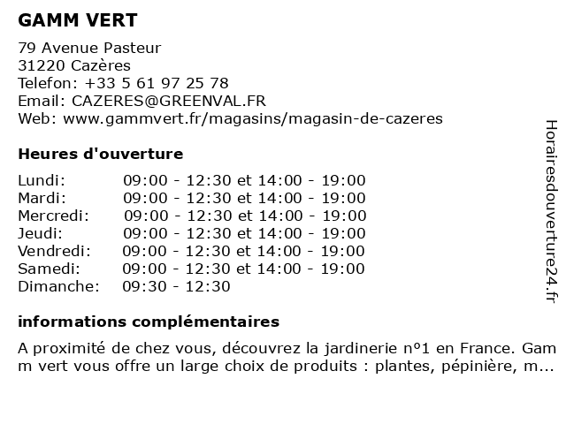 | Samedi | 09:00-12:30 et 14:00-19:00 |