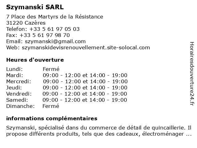| Samedi | 09:00-12:00 et 14:00-19:00 |
