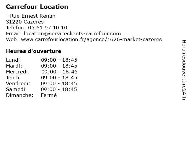 1 Carrefour Location (Distance: 15,77 km) - Avenue Jean Monnet, 31390 Carbonne automobiles, carrefour, déménagements, location, market, véhicules 2 Carrefour Drive (Distance: 0,00 km) - Rue Ernest Renan, 31220 Cazères alimentaire, carrefour, courses, drive, en ligne, magasin 3 Carrefour Market (Distance: 0,27 km) - Rue Ernest Renan, 31220 Cazères alimentation, carrefour, magasin discount, market, supermarché 4 Carrefour Contact (Distance: 9,18 km) - Lieu Dit Les Clotes, 31430 Le Fousseret alimentation, carrefour, contact, magasin discount, market, supermarché 5 Carrefour Contact (Distance: 11,68 km) 19 Avenue des Pyrénées, 31310 Montesquieu-Volvestre alimentation, carrefour, contact, magasin discount, market, supermarché 6 Carrefour Contact (Distance: 15,40 km) - Zone d'Activité Coumatou, 31420 Aurignac alimentation, carrefour, contact, magasin discount, market, supermarché |