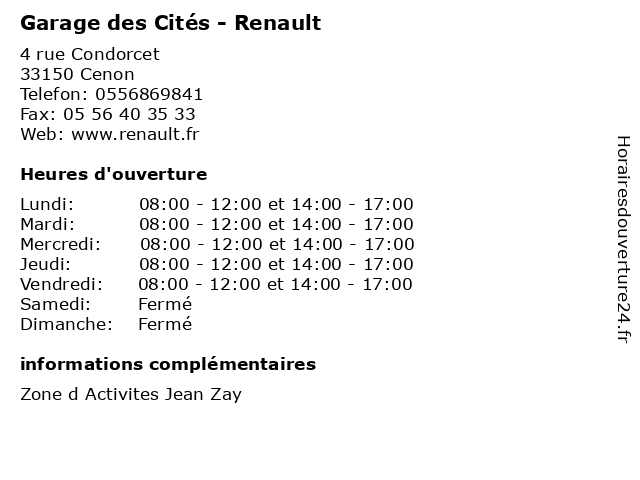 1 Renault Trucks Aquitaine - Renault Trucks (Distance: 0,96 km) . Avenue Descartes, 33370 Artigues Près Bordeaux aquitaine, camion, entretien, garage, lourds, renault, réparation, truck, trucks, vente 2 Renault Tresses Automobiles (Distance: 2,57 km) 56 Avenue de Branne, 33370 Tresses automobiles, renault, tresses 3 Renault Retail Group (Exposition Dacia) (Distance: 2,77 km) 29 Avenue de Paris, 33310 Lormont automobiles, dacia, exposition, garage, group, motos - concessionnaire, renault, retail 4 Renault Retail Group (Véhicule d'Occasion) (Distance: 2,77 km) 29 Avenue de Paris, 33310 Lormont automobiles, d'occasion, garage, group, motos - concessionnaire, renault, retail, véhicule 5 Renault Retail Group (Véhicule Neuf) (Distance: 2,77 km) 29 Avenue de Paris, 33310 Lormont automobiles, garage, group, motos - concessionnaire, neuf, renault, retail, véhicule 6 Renault - Borne de Recharge Electrique (Distance: 2,83 km) 29 avenue de Paris, 33310 Lormont borne, de, electrique, recharge, renault, électrique |