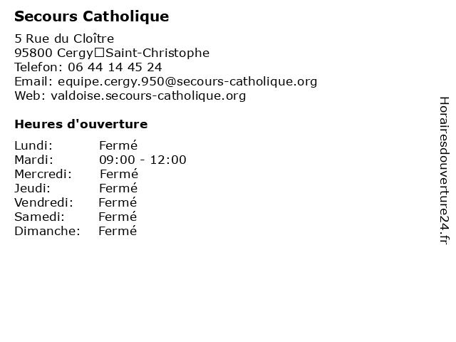 2 Secours Catholique (Distance: 0,22 km) 12 rue de la Bastide, 95808 Cergy Pontoise actions, bénévolat, catholique, dons, partage, secours 3 Secours Catholique (Distance: 1,66 km) 5 Résidence du Vauvarois, 95520 Osny accueil, association, catholique, organisation, secours 4 Secours Catholique (Distance: 3,93 km) 3 bis Avenue des Bruzacques, 95280 Jouy-le-Moutier accueil, association, catholique, organisation, secours 5 Secours Catholique (Distance: 4,16 km) 10 Rue des Maréchaux, 95800 Pontoise accueil, association, catholique, organisation, secours 6 Secours Catholique (Distance: 5,08 km) 24 Allée du Nivernais, 95310 Saint Ouen l'Aumône accueil, association, catholique, organisation, secours |