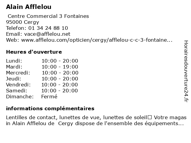1 Alain Afflelou (Distance: 4,50 km) - chemin du poirier, 95520 Osny afflelou, alain, lunettes, montures, opticien, optique 2 Alain Afflelou (Distance: 8,76 km) Alain Afflelou Ccal Le Grand Cedre, 78260 Acheres afflelou, alain, divers, détail, magasins, nra, optic, sjfs 3 Alain Afflelou (Distance: 14,10 km) 67 Centre Commercial, 78410 Flins accessoires, afflelou, alain, beaute&sante, cafe, chaussures, enfants, mode femmes, mode hommes, optique, restaurant, service, sport 4 Alain Afflelou (Distance: 15,05 km) . Route Nationale 13, 78240 Chambourcy afflelou, alain, lentilles, lunettes, opticien, optique 5 Alain Afflelou (Distance: 17,67 km) Centre Commercial Les Grandes Terres, 78160 Marly-Le-Roi afflelou, alain, magasin de lunettes de soleil, magasin d’accessoires de mode, optométrie 6 Alain Afflelou (Distance: 19,92 km) Centre Commercial Les 4 Temps, 92800 Puteaux afflelou, alain, magasin de lunettes de soleil, magasin d’accessoires de mode, optométrie |